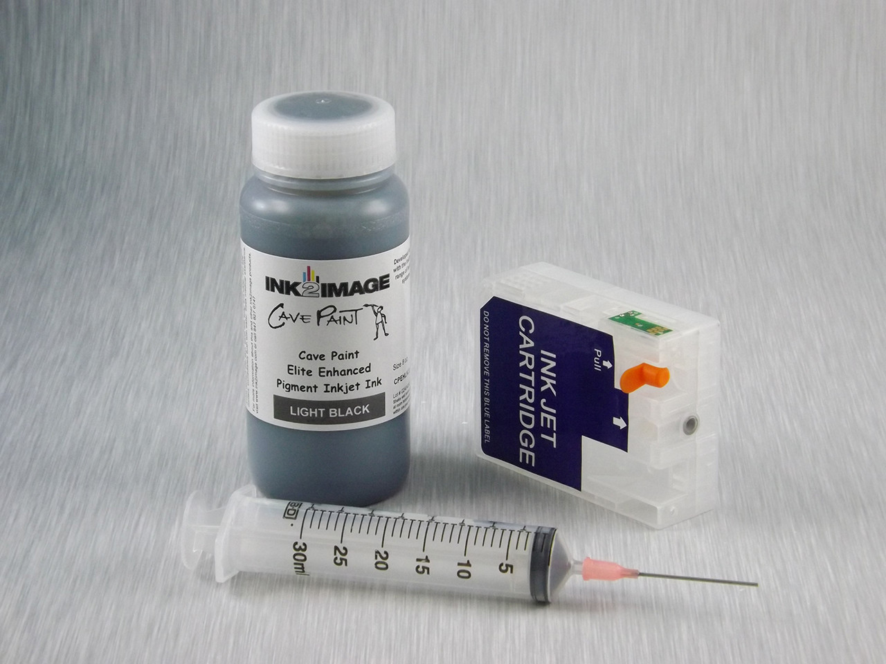 Light Black Refillable Cartridge for the Epson Pro 3800/3880 with 1 x 8 oz Bottle of Cave Paint Elite Enhanced Light Black pigment ink (needs chip from original cartridge)