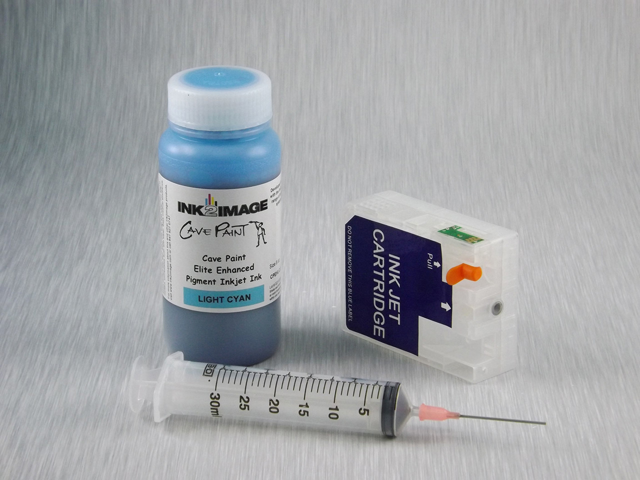 Light Cyan Refillable Cartridge for the Epson Pro 3800/3880 with 1 x 8 oz Bottle of Cave Paint Elite Enhanced Light Cyan pigment ink (needs chip from original cartridge)