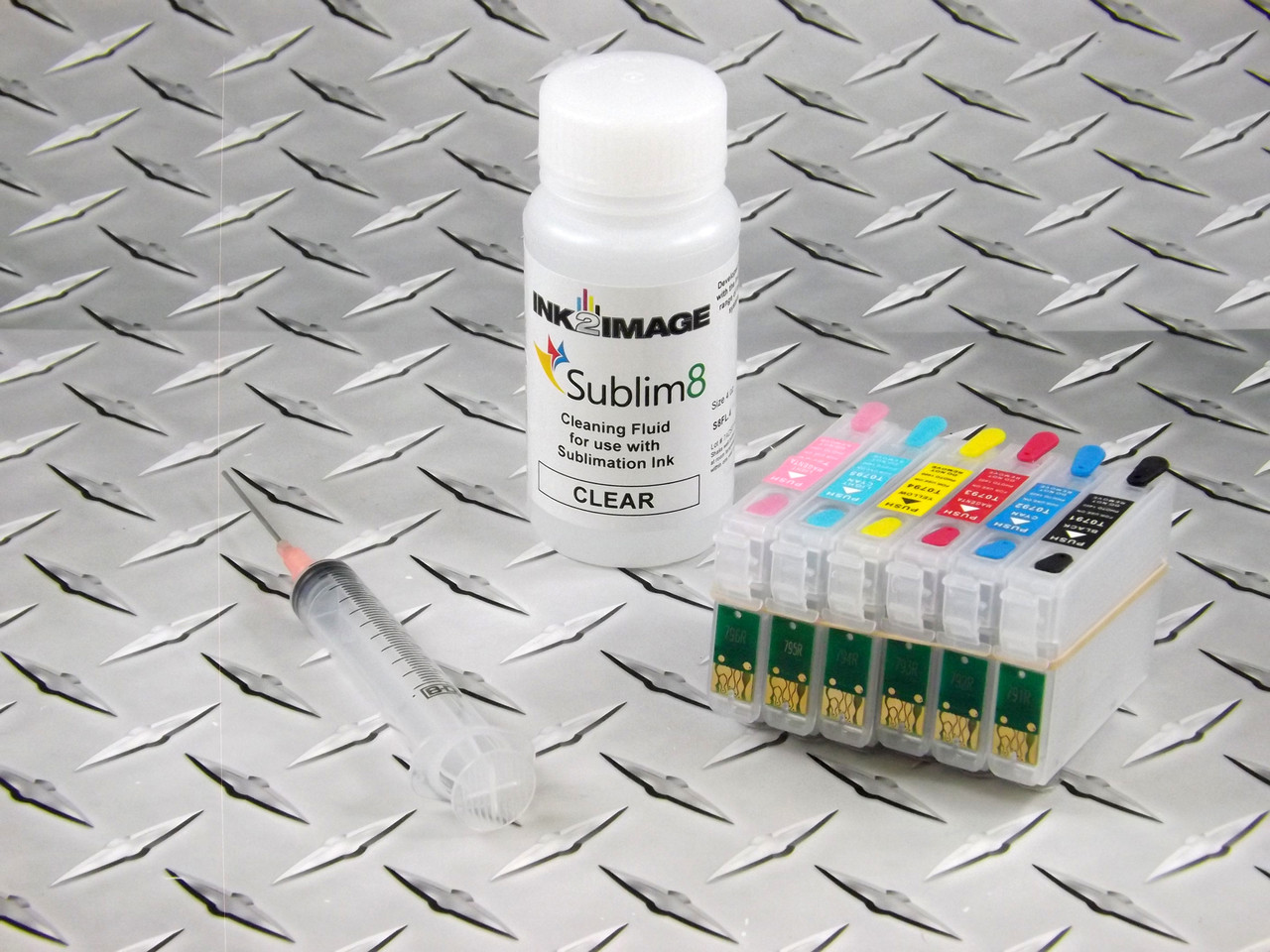 Sublim8 cleaning flush kit for Epson Photo 1400 and Artisan 1430. Includes full set of refillable cartridges, 1 x 4 oz bottle of Sublim8 cleaning fluid, filling syringe, and full instructions.