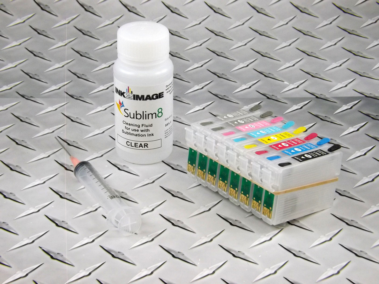 Sublim8 cleaning flush kit for Epson Photo R2880. Includes full set of refillable cartridges, 1 x 4 oz bottle of Sublim8 cleaning fluid, filling syringe, and full instructions.