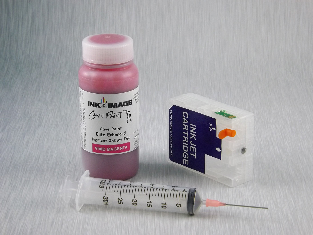 Vivid Magenta Refillable Cartridge for the Epson Pro 3880 with 1 x 8 oz Bottle of Cave Paint Elite Enhanced Vivid Magenta pigment ink (needs chip from original cartridge)