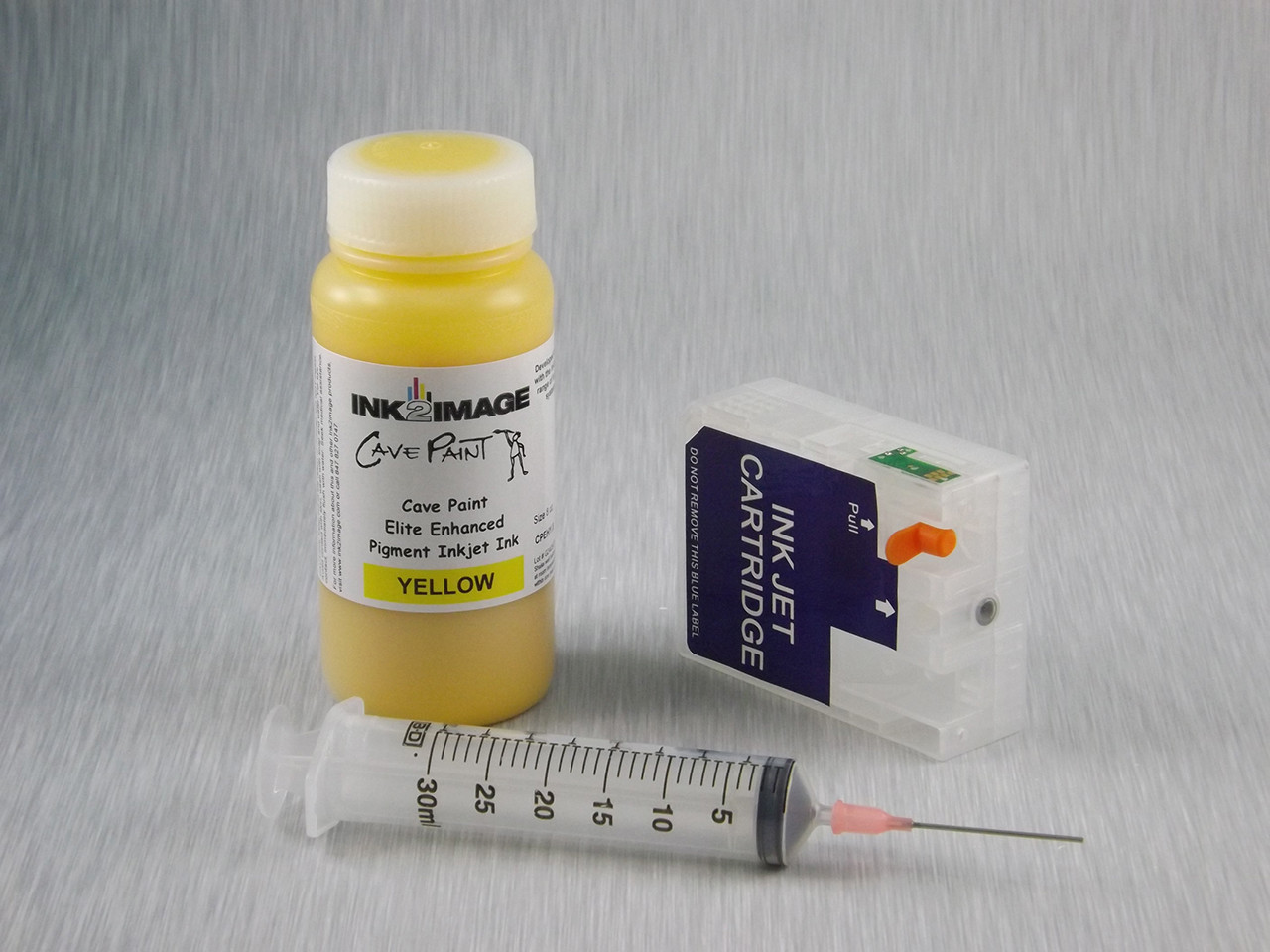 Yellow Refillable Cartridge for the Epson Pro 3800/3880 with 1 x 8 oz Bottle of Cave Paint Elite Enhanced Yellow pigment ink (needs chip from original cartridge)